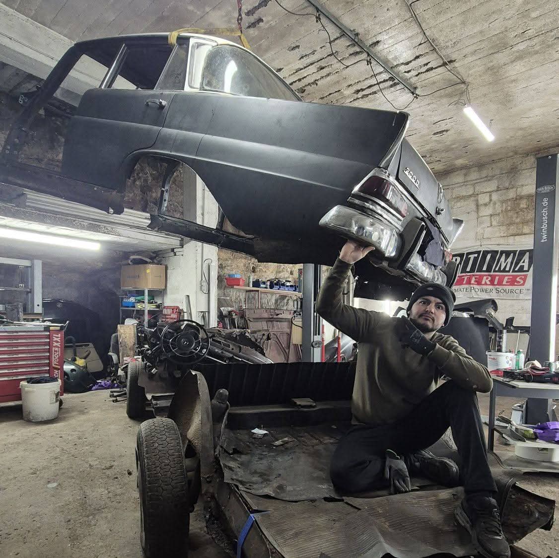Dans son atelier, le sol est jonché de morceaux de châssis, de